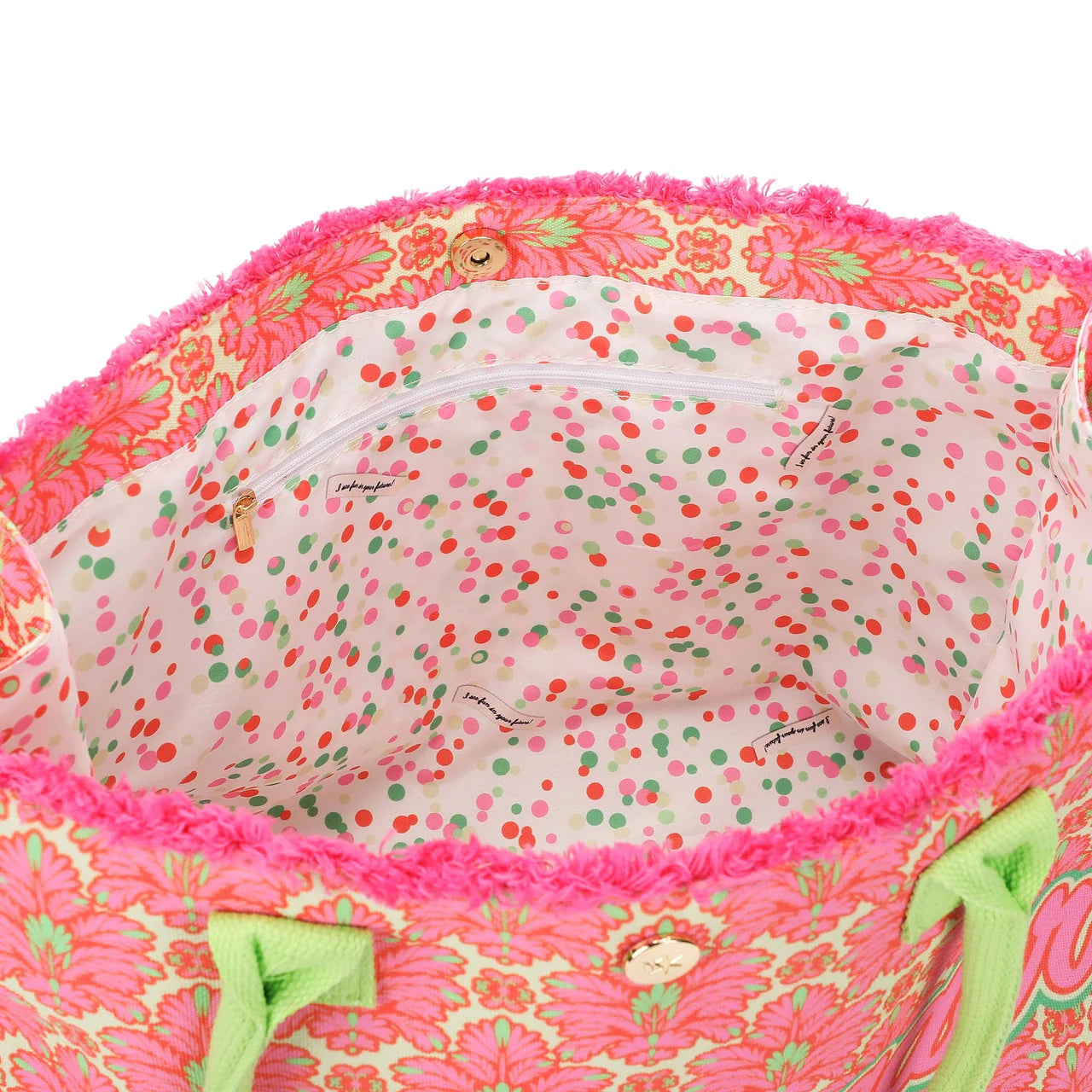 Inside, you’ll find thoughtful details that make it extra special — including a secure zippered pocket for essentials and a cheerful confetti-printed lining filled with festive sayings that add a surprise smile every time you peek inside.