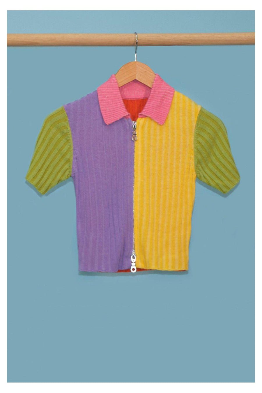 This on trend brand new season, The Ragged Priest colour block ribbed short sleeved top comes in lilac, yellow, orange, green and pink with front zip detailing and pink collar.